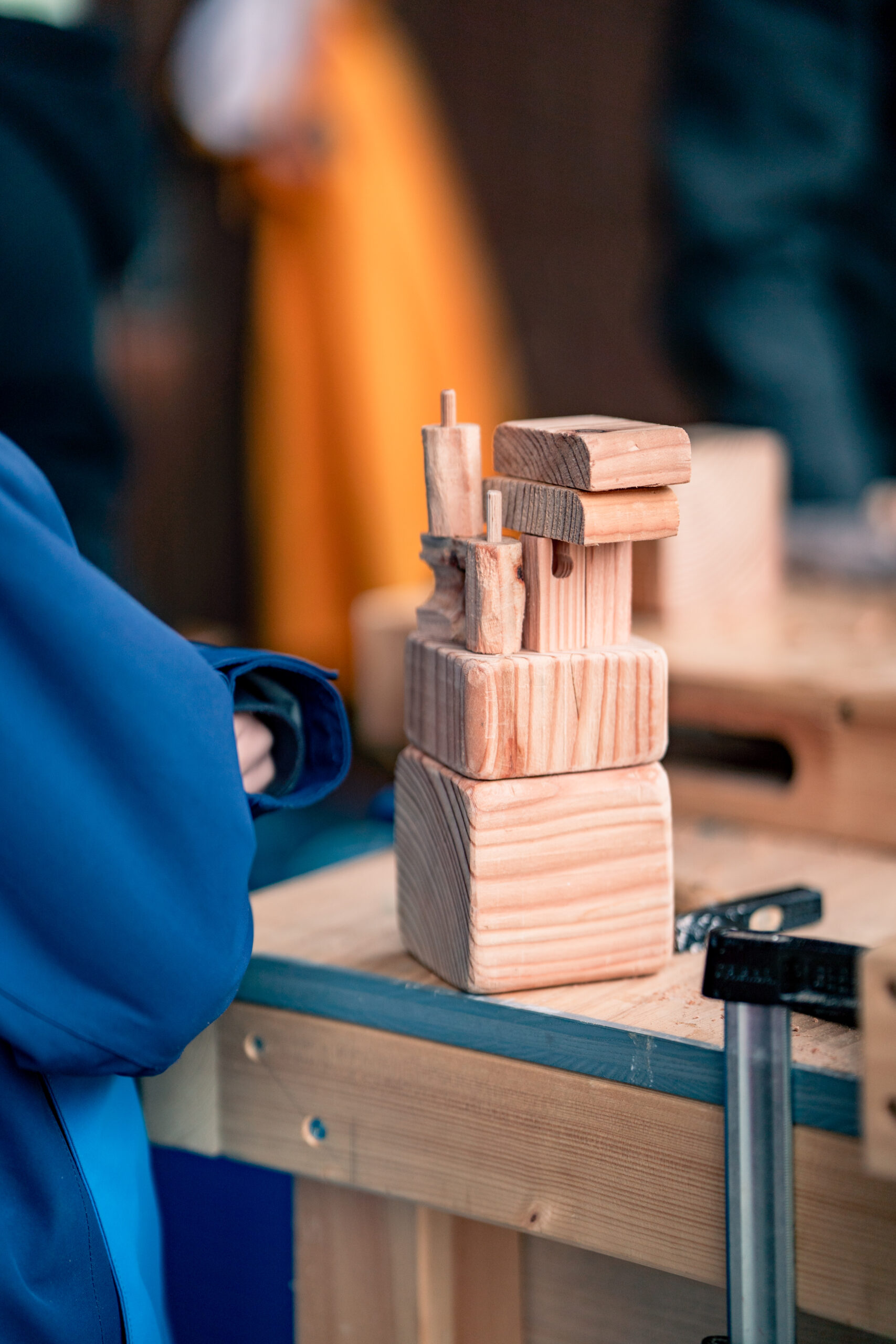 Fixiere die Holzstücke für die Arme sicher mit einer Schraubzwinge.